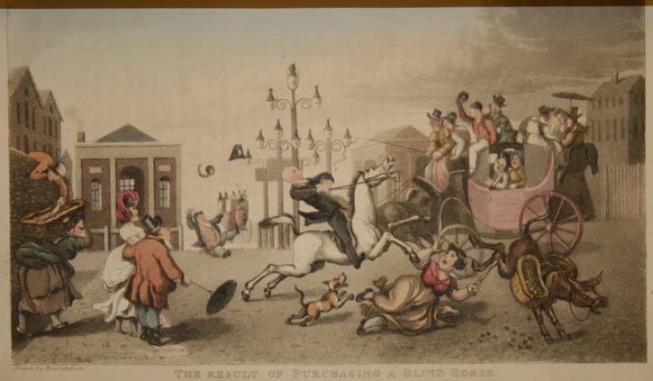 "The result of purchasing a blind horse." Hand-colored aquatint by Thomas Rowlandson.